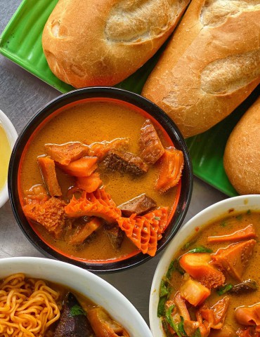 Review món Phá Lấu bò nước cốt dừa - đặc sản vỉa hè Sài Gòn. Tìm hiểu hương vị độc đáo của lòng bò khìa nước dừa chấm mắm me chua ngọt.